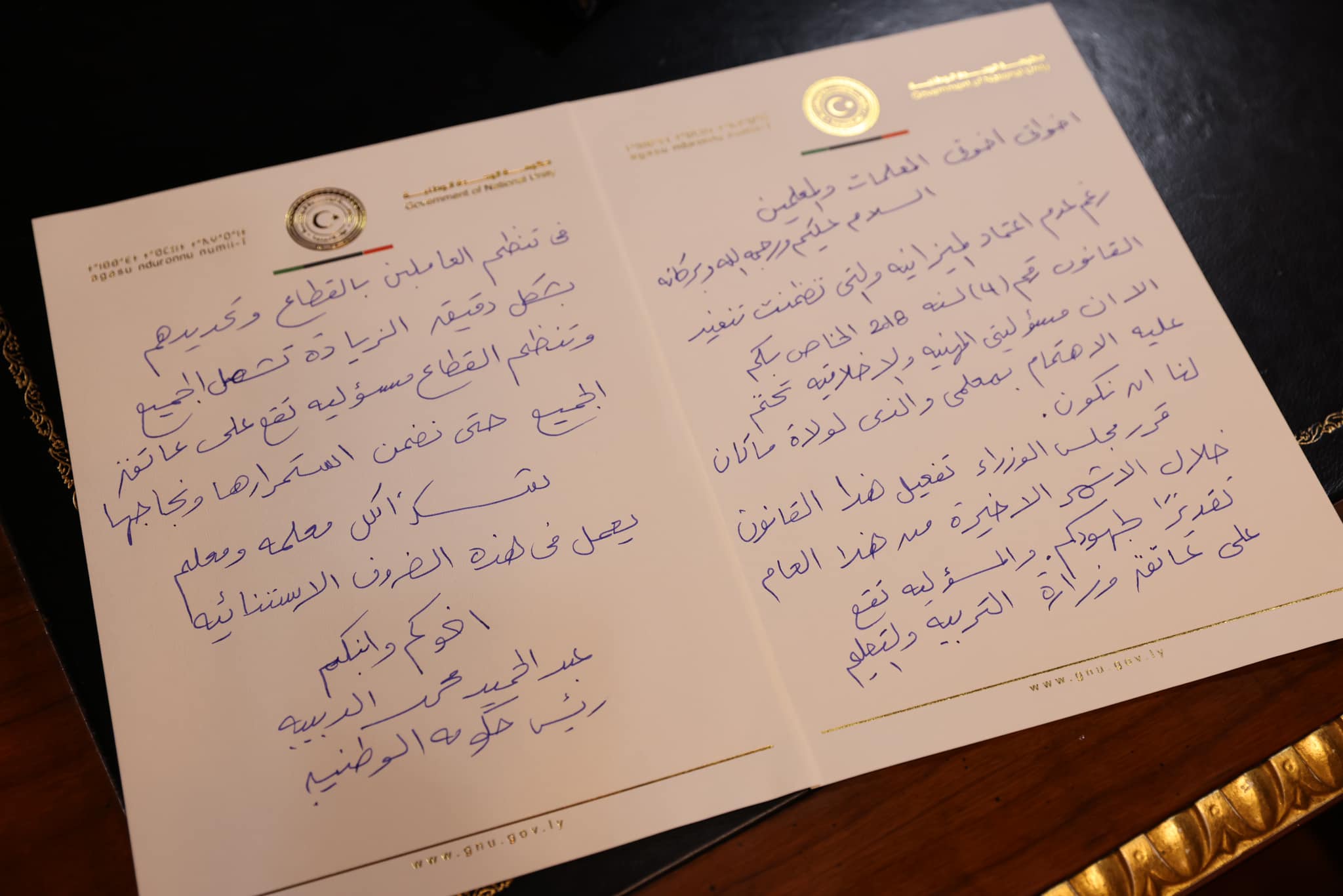 أصدر رئيس حكومة الوحدة الوطنية السيد عبدالحميد الدبيبة مساء اليوم الخميس قرار مجلس الوزراء، لتنفيذ قانون رقم 4 لسنة 2018 الصادر عن مجلس النواب والذي يتضمن زيادة مرتبات المعلمين.على أن يتم البدء في تنفيذها اعتبارًا من شهر سبتمبر للعام الجاري.